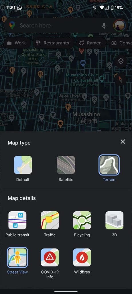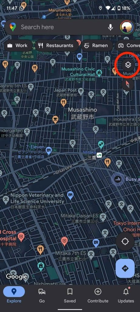 2. Look for the Layers icon in the top-right corner of the screen. It is the icon that lets you choose the different types of maps and additional details you can display.