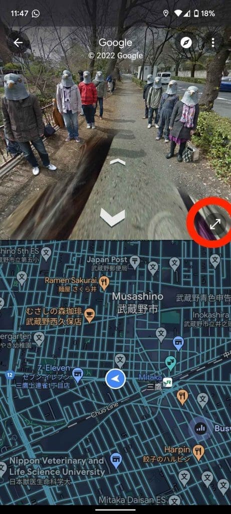 5. To access split-screen mode, where Street View takes up the top half of the screen and the map takes up the bottom half, hover over the map preview and click on the Expand icon in the lower-left corner.